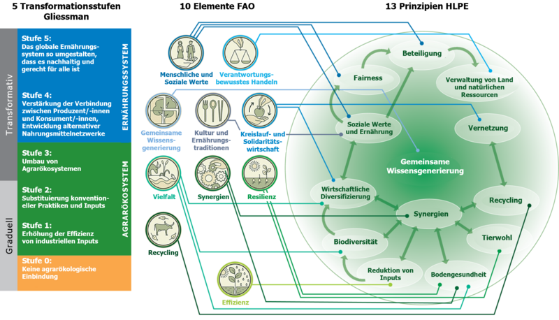 Agrarökologie wird am IfA als ganzheitlicher Ansatz verstanden, der in der ökologischen, wirtschaftlichen, sozialen und politischen Dimension von Landwirtschaft und Ernährung verankert ist. Angelehnt an Gliessman (2016)1 kann Agrarökologie in allen Produktionssystemen und von allen Akteuren genutzt werden, um gemeinsam und faktenbasiert nachhaltige Lösungen zu entwickeln. Die zehn Elemente der FAO6 und die 13 Prinzipien des HLPE7 bieten eine universelle Grundlage, müssen jedoch regional spezifisch gewichtet werden. Von den Kernelementen oder den Prinzipien hin zu einer Landwirtschafts- oder Ernährungspraxis fehlen jedoch noch viele Umsetzungsschritte. Ein agrarökologisches Landwirtschaftssystem oder eine agrarökologische Ernährung können erst dann genau definiert werden, wenn die einzelnen Praktiken entlang der gesamten Wertschöpfungskette im Detail bekannt sind.